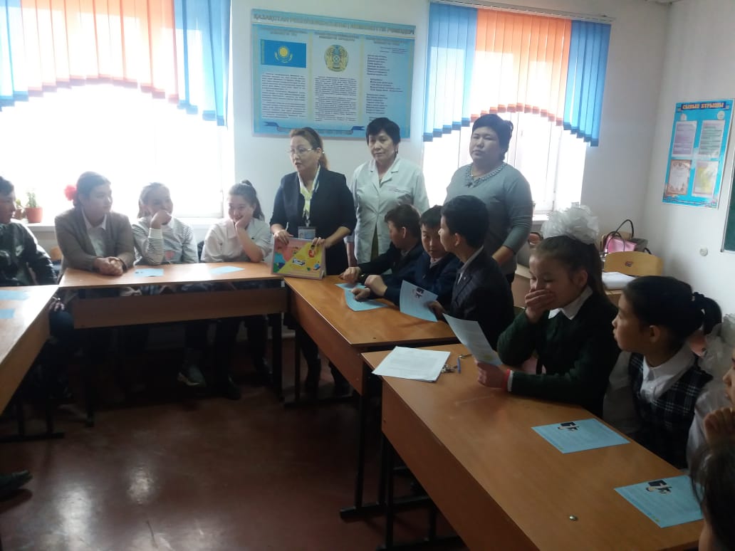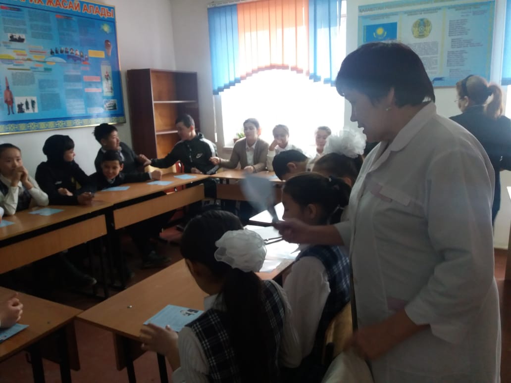 Денсаулық сабағына: Қызылорда облыстық салауатты өмір салтын қалыптастыру орталығы ЖШС-нің «Алдын алу бағдарламаларының» менеджері, «Жұқпалы аурулардың алдын алу бағдарламасының» үйлестірушісі – Каримсакова Ботагөз Демеуқызы; № 5 қалалық емханасының СӨСҚ маманы – Баймишева Сәуле Қазанғапқызы, психологы – Мақсат Сілтаев, Облыстық жастар денсаулығы орталығының валеолог маманы – Мазқожа Гүлназ Рысбекқызы қатыса отырып, соңғы айларда Қазақстанда қызылшамен сырқаттанушылық жағдайының тіркеліп жатқандығын айта келе әр адамның ауруға қатысты білулеріне керекті ақпараттары баяндалды, бүгінгі таңда біздің облыста да біршама аурушаңдықтың тіркелгендегіндігі мен эпидемиологиялық жағдайдағы басты сақтық шаралары презентациялық слайдпен түсіндірілді. Тақырыптық бейнероликтер көрсетілді. «Қол тазалығы» мен «Жөтелу әдебі», «Қауіпсіз тағам таңда», «Психикалық денсаулық» жөнінде балалармен бірлесе тренинг өткізілді. Барлығы – 34-ке тарта адам қатысқан шарада 170 ақпараттық танымдық материалдар таратылды.